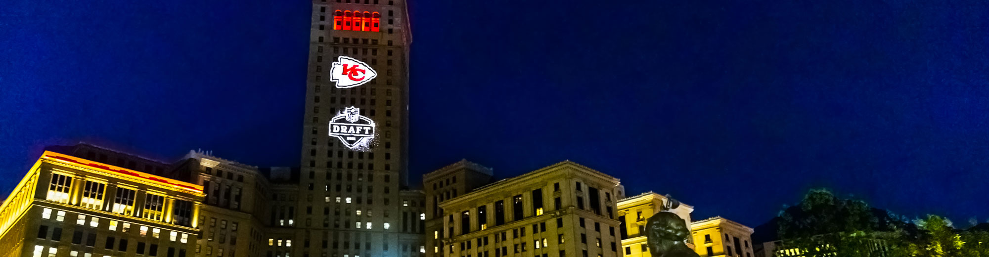 When it was built back in the 1920s, Terminal Tower was the second tallest building in the world. The task of turning this landmark building into a spectacular backdrop to the Draft ceremony fell to Vincent Lighting Systems (VLS), a specialist in entertainment and architectural lighting projects. Working for the Greater Cleveland Sports Commission (GCSC) and with NFL Creative Services, the K&D Group who own the building, and a technical team which included High Output of Boston, VLS designed a creative array of three Christie projectors to light up the building with the team’s colors and logos.