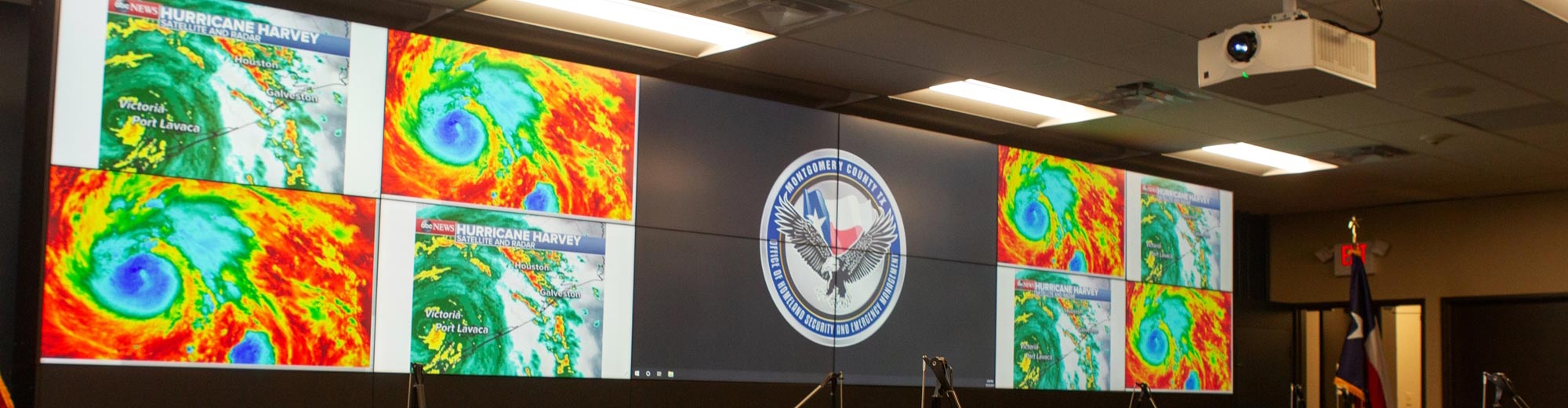 CONROE, Texas- The Christie® Terra solution has formed the backbone of a major technological overhaul at Montgomery County Emergency Operations Center (EOC) in Conroe, Texas. The mission critical EOC acts as a central point for government officials and local agencies to analyze incoming data and manage response efforts to large scale events or disasters, such as hurricanes. With Terra, a flexible SDVoE (Software Defined Video over Ethernet) based solution, a signal can now be distributed to any of the displays on-site via 10G Ethernet. A host of display technology – including 12 Christie Extreme Series 55-inch LCD displays - has also been installed throughout, allowing leaders, activated departments, and first responders to interpret and respond to unfolding and rapidly changing events.