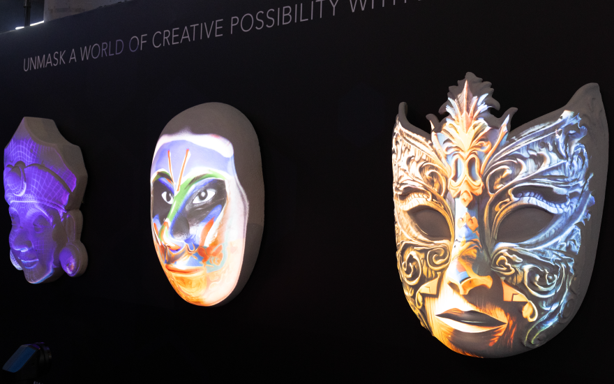 One of the busiest experiences on our stand was an interactive projection mapping display onto three masks. Visitors were invited to take part in the content development by creating the artwork to project onto a Venetian, Indian, or Chinese opera mask. Illuminated by our new Korus Series 4K 1DLP projectors paired with a Ross Video media server, the masks came alive with color.